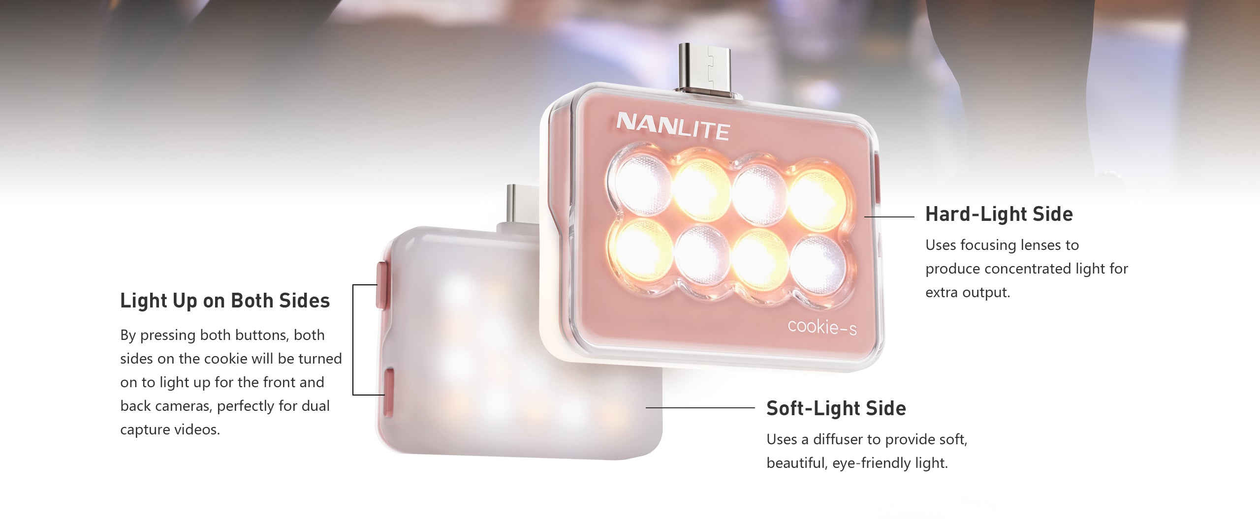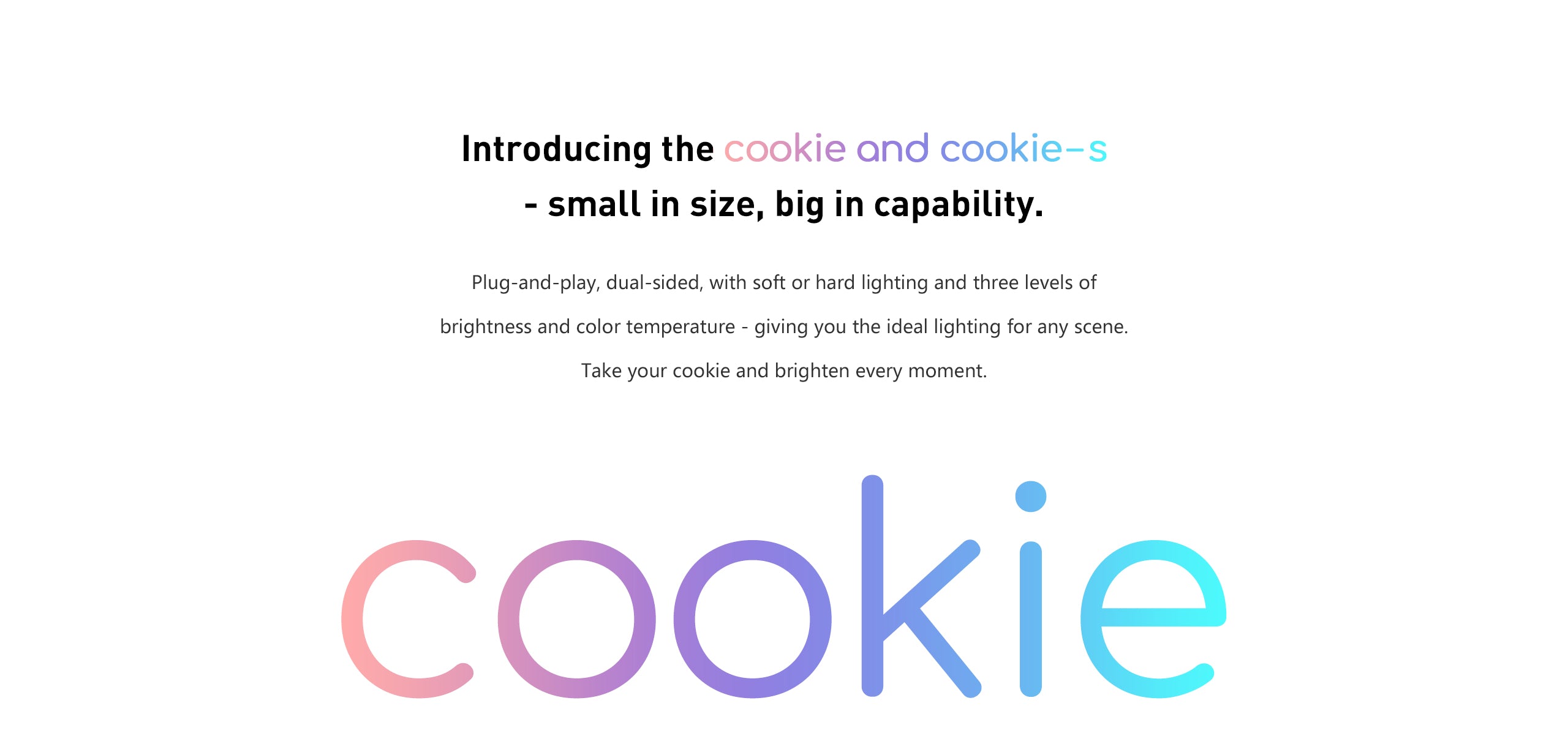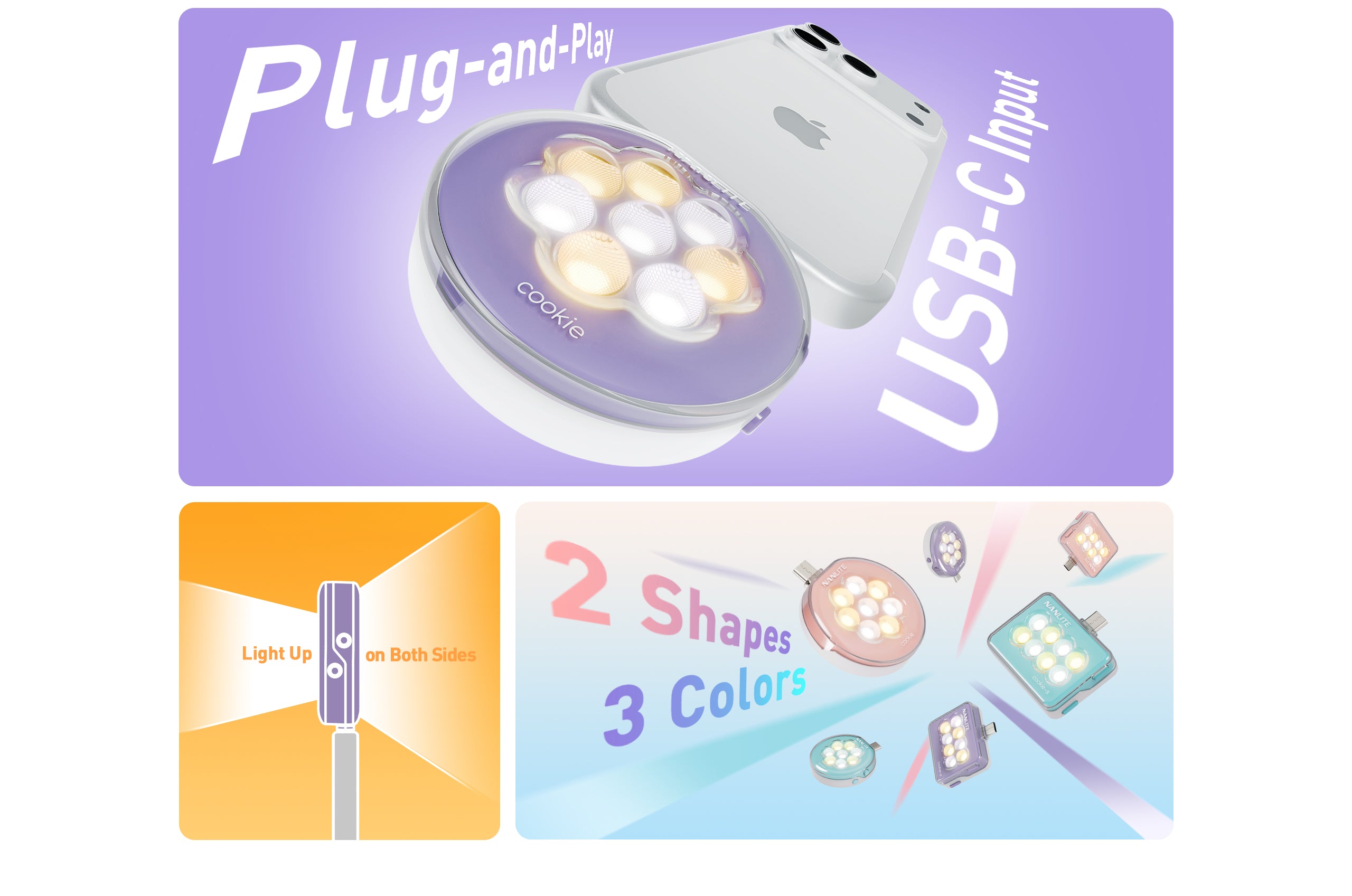 The cookie features a plug-and-play external power design. Simply plug it into smartphones or other power devices with USB-C output to power it up –– allowing you to have bright lighting anytime, anywhere.