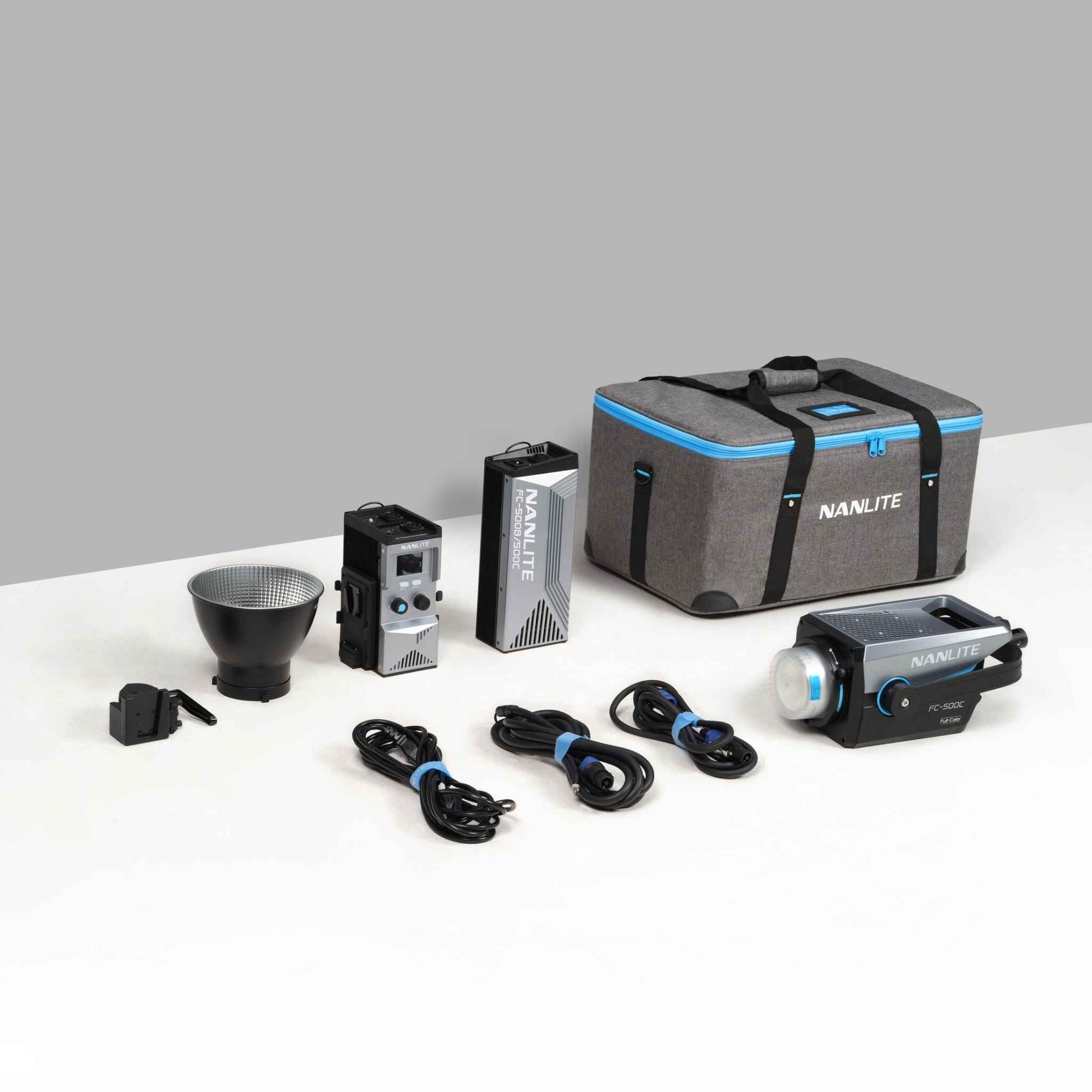 This is a kit that includes a Nanlite FC-500C RGBW Color LED Spotlight, an AC power adapter, an FC PowerController that lets you use the light on battery power, and a padded case that holds it all.