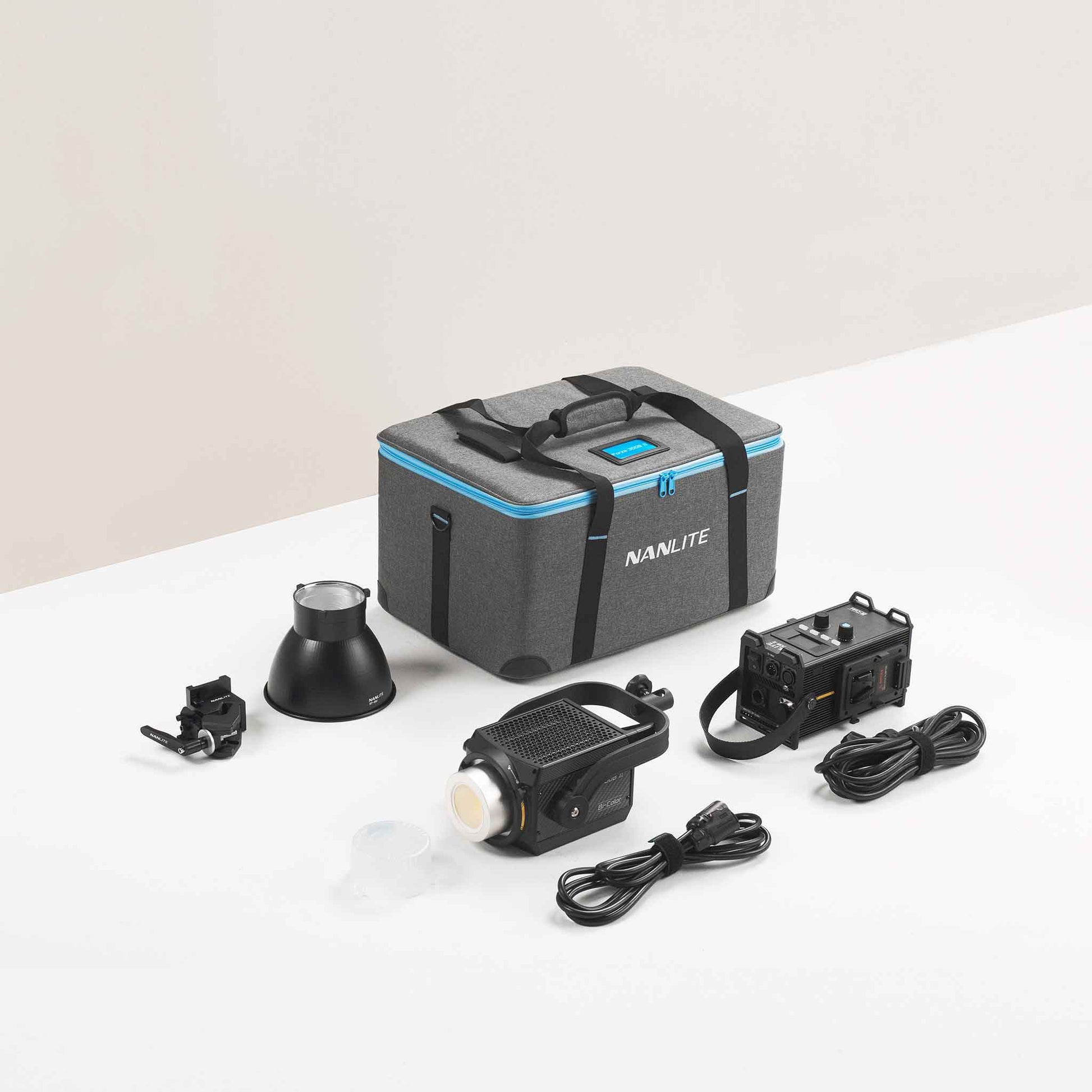 The included cables are substantially longer: 19.8 feet (6 m) for the power cable, 9.8 feet (3 m) for the head cable, and considerably longer head cables are available separately. It's compatible with a vast number of Bowens Mount light modifiers, including Nanlite's own offerings. A useful 55° reflector is included, and with the FL-20G Fresnel (sold separately), output increases to 151000 Lux, 14028.3 fc at 1 meter.