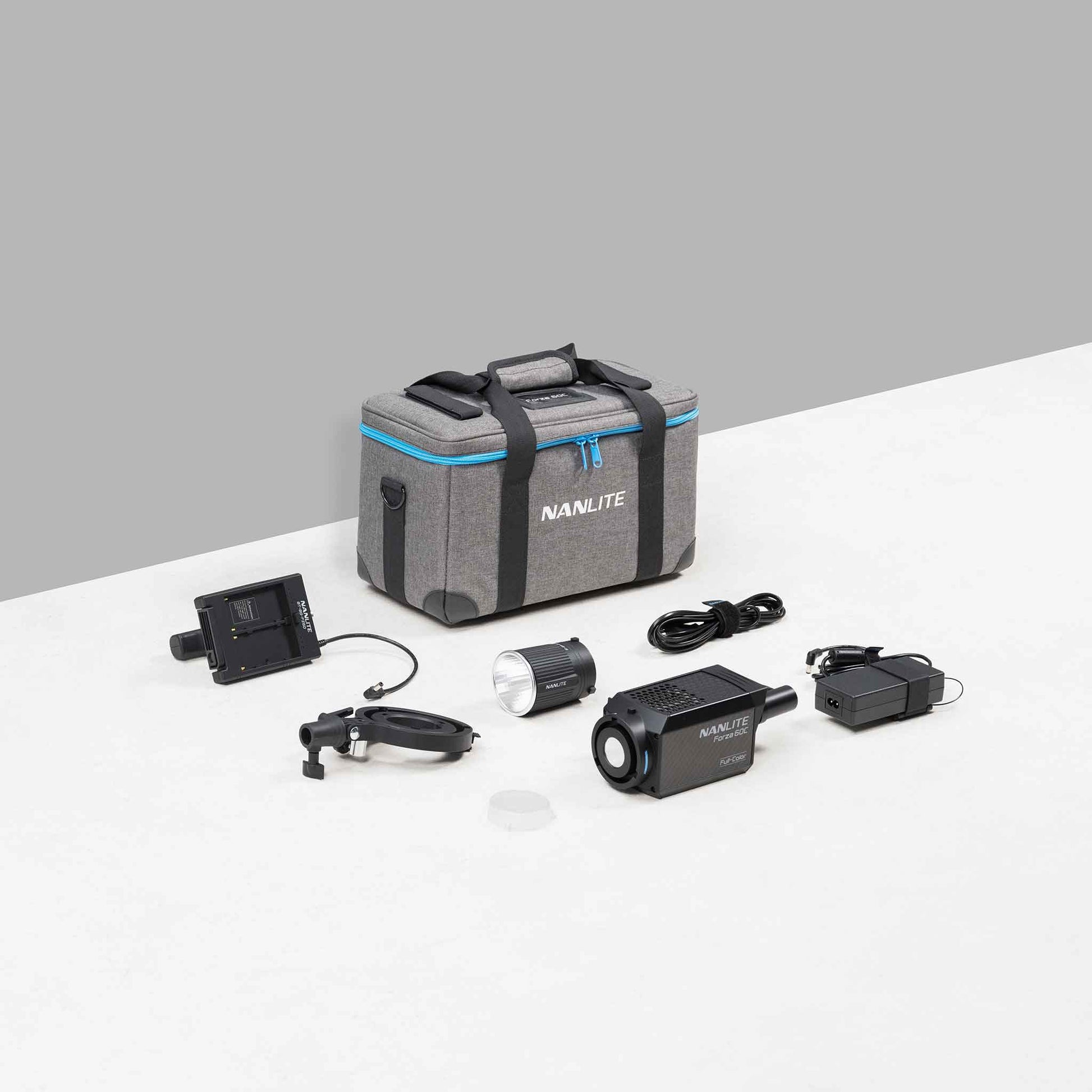 A Bowens-mount adapter with an umbrella holder is included with the Forza 60C RGBLAC for nearly unlimited light-shaping options. A battery handgrip is also included, which has plates for 2 NP-F batteries, an LED battery-life meter, and a stand mount.