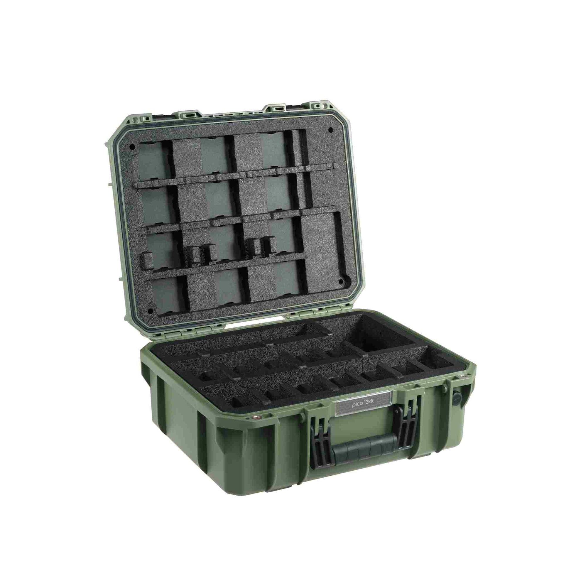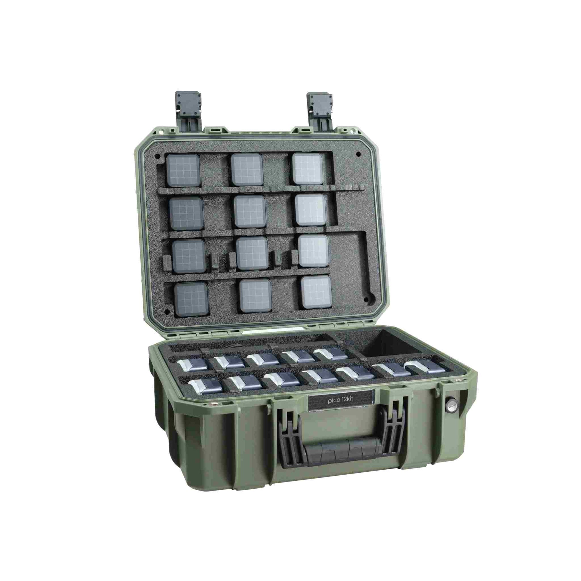 This is a 12-light kit that includes a GUTEK T-230 Protector Case, 12 EC-PICO Magnetic Eggcrates, 12 Magnetic Diffusers, 12 Cold Shoe Adapters, and 12 USB-C Cables. The picos have Midnight Blue colored bodies. The EC-PICO Eggcrates minimize light spill on nearby objects and surfaces, and easily attach and detach.