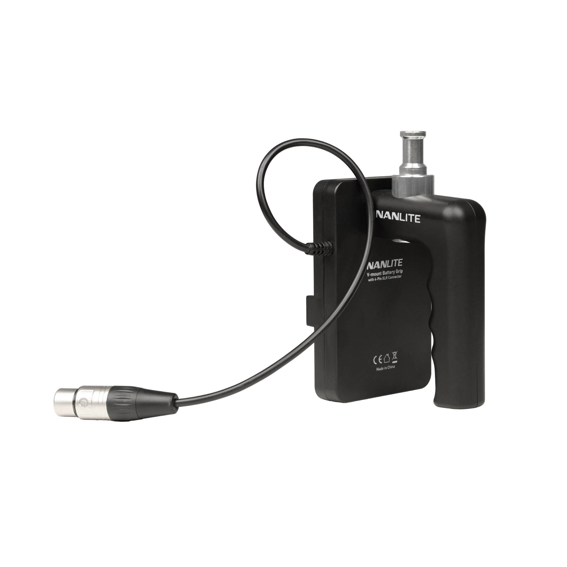 The Nanlite V-Mount Battery Grip with 4-Pin XLR Connector lets you use the FC-120C, FC-120B, Forza 60B, or Forza 150B spotlights completely untethered either handheld, or mounted to a stand with the built-in 5/8" receiver. This grip has an attachment for a single V-Mount battery (sold separately) and a built-in D-Tap cable to connect to the battery. A short cable with a locking female 4-pin XLR connector is also built-in to connect to the light. Now you can get creative with handheld lighting techniques, or mount your light to a stand as an ultracompact, all-in-one, battery-powered fixture.